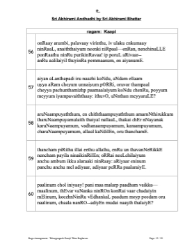 56 57 58 59 60 உ Sri Abhirami Andhadhi by Sri Abhirami Bhattar ragam: Kaapi onRaay arumbi, palavaay virinthu, iv ulaku enkumaay ninRaaL, anaiththaiyum neenki niRpaal—enRan, nenchinuLLE ponRaathu ninRu purikinRavaa! ip poruL aRivaar-- anRu aalilaiyil thuyinRa pemmaanum, en aiyanumE. aiyan aLanthapadi iru naazhi koNdu, aNdam ellaam uyya aRam cheyum unnaiyum pORRi, oruvar thampaal cheyya pachunthamizhp paamaalaiyum koNdu chenRu, poyyum meyyum iyampavaiththaay: ithuvO, uNnthan meyyaruLE? aruNaampuyaththum, en chiththaampuyaththum amarnNthirukkum tharuNaampuyamulaith thaiyal nallaaL, thakai chEr nNayanak karuNaampuyamum, vadhanaampuyamum, karaampuyamum, charaNaampuyamum, allaal kaNdilEn, oru thanchamE. thancham piRithu illai eethu allathu, enRu un thavanNeRikkE nencham payila ninaikinRilEn; oRRai neeLchilaiyum anchu ambum ikku alaraaki ninRaay: aRiyaar eninum panchu anchu mel adiyaar, adiyaar peRRa paalaraiyE. paalinum chol iniyaay! pani maa malarp paadham vaikka— maalinum, thEvar vaNanka ninROn konRai vaar chadaiyin mElinum, keezhnNinRu vEdhankaL paadum meyp peedam oru naalinum, chaala nanRO--adiyEn mudai naayth thalaiyE? Raga Arrangement: Thiruppugazh Guruji Thiru Raghavan Page: 13 / 22