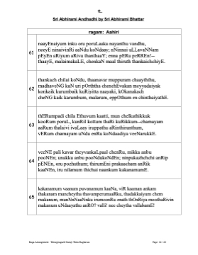 61 62 63 64 65 உ Sri Abhirami Andhadhi by Sri Abhirami Bhattar ragam: Aahiri naayEnaiyum inku oru poruLaaka nayanthu vandhu, neeyE ninaivinRi aaNdu koNdaay; nNinnai uLLavaNNam pEyEn aRiyum aRivu thanthaaY; enna pERu peRREn!-- thaayE, malaimakaLE, chenkaN maal thiruth thankaichchiyE. thankach chilai koNdu, thaanavar muppuram chaayththu, madhaveNG kaN uri pOrththa chenchEvakan meyyadaiyak konkaik kurumbaik kuRiyitta naayaki, kOkanakach cheNG kaik karumbum, malarum, eppOthum en chinthaiyathE. thERumpadi chila Ethuvum kaatti, mun chelkathikkuk kooRum poruL, kunRil kottum thaRi kuRikkum--chamayam aaRum thalaivi ivaLaay iruppathu aRinthirunthum, vERum chamayam uNdu enRu koNdaadiya veeNarukkE. veeNE pali kavar theyvankaLpaal chenRu, mikka anbu pooNEn; unakku anbu pooNdukoNdEn; ninpukazhchchi anRip pENEn, oru pozhuthum; thirumEni prakaacham anRik kaaNEn, iru nilamum thichai naankum kakanamumE. kakanamum vaanum puvanamum kaaNa, viR kaaman ankam thakanam muncheytha thavamperumaaRku, thadakkaiyum chem mukanum, munNnNaaNnku irumoonRu enath thOnRiya moothaRivin makanum uNdaayathu anRO? valli! nee cheytha vallabamE! Raga Arrangement: Thiruppugazh Guruji Thiru Raghavan Page: 14 / 22