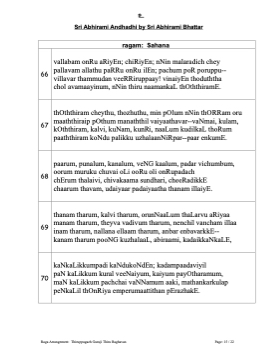66 67 68 69 70 உ Sri Abhirami Andhadhi by Sri Abhirami Bhattar ragam: Sahana vallabam onRu aRiyEn; chiRiyEn; nNin malaradich chey pallavam allathu paRRu onRu ilEn; pachum poR poruppu-- villavar thammudan veeRRiruppaay! vinaiyEn thoduththa chol avamaayinum, nNin thiru naamankaL thOththiramE. thOththiram cheythu, thozhuthu, min pOlum nNin thORRam oru maaththiraip pOthum manaththil vaiyaathavar--vaNmai, kulam, kOththiram, kalvi, kuNam, kunRi, naaLum kudilkaL thoRum paaththiram koNdu palikku uzhalaanNiRpar--paar enkumE. paarum, punalum, kanalum, veNG kaalum, padar vichumbum, oorum muruku chuvai oLi ooRu oli onRupadach chErum thalaivi, chivakaama sundhari, cheeRadikkE chaarum thavam, udaiyaar padaiyaatha thanam illaiyE. thanam tharum, kalvi tharum, orunNaaLum thaLarvu aRiyaa manam tharum, theyva vadivum tharum, nenchil vancham illaa inam tharum, nallana ellaam tharum, anbar enbavarkkE-- kanam tharum pooNG kuzhalaaL, abiraami, kadaikkaNkaLE, kaNkaLikkumpadi kaNdukoNdEn; kadampaadaviyil paN kaLikkum kural veeNaiyum, kaiyum payOtharamum, maN kaLikkum pachchai vaNNamum aaki, mathankarkulap peNkaLil thOnRiya emperumaattithan pErazhakE. Raga Arrangement: Thiruppugazh Guruji Thiru Raghavan Page: 15 / 22