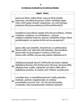 86 87 88 89 90 உ Sri Abhirami Andhadhi by Sri Abhirami Bhattar ragam: Atana maal ayan thEda, maRai thEda, vaanavar thEda nNinRa kaalaiyum, choodakak kaiyaiyum, koNdu--kathiththa kappu vElai veNG kaalan eNnmEl vidumpOthu, veLi nNil kaNdaay paalaiyum thEnaiyum paakaiyum pOlum paNimozhiyE! mozhikkum ninaivukkum ettaatha nNin thirumoorththam, eNnthan vizhikkum vinaikkum veLinNinRathaal,--vizhiyaal madhanai azhikkum thalaivaa, azhiyaa virathaththai aNdam ellaam pazhikkumpadi, oru paakam koNdu aaLum paraaparaiyE! param enRu unai adainthEn, thamiyEnum; un paththarukkuL 'tharam anRu ivan' enRu thaLLath thakaathu--thariyalardham puram anRu eriyap poruppuvil vaankiya, pOthil ayan chiram onRu cheRRa, kaiyaan idap paakam chiRanthavaLE! chiRakkum kamalath thiruvE! nNiNnchEvadi chenni vaikkath thuRakkam tharuma nNin thuNaivarum nNeeyum, thuriyam aRRa uRakkam thara vandhu, udampOdu uyir uRavu aRRu aRivu maRakkum pozhuthu, en munnE varal vENdum varunthiyumE. varunthaavakai, en manaththaamaraiyinil vandhu pukunthu, irunthaaL, pazhaiya iruppidamaaka; ini enakkup porunthaathu oru poruL illai--viN mEvum pulavarukku virunthaaka vElai marunthaanathai nNalkum melliyalE! Raga Arrangement: Thiruppugazh Guruji Thiru Raghavan Page: 19 / 22