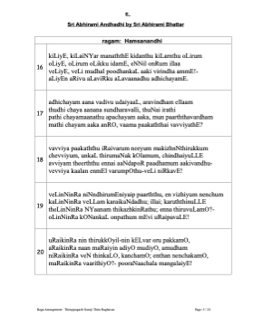 16 17 18 19 20 உ Sri Abhirami Andhadhi by Sri Abhirami Bhattar ragam: Hamsanandhi kiLiyE, kiLaiNYar manaththE kidanthu kiLarnthu oLirum oLiyE, oLirum oLikku idamE, eNNil onRum illaa veLiyE, veLi mudhal poodhankaL aaki virindha ammE!- aLiyEn aRivu aLaviRku aLavaanadhu adhichayamE. adhichayam aana vadivu udaiyaaL, aravindham ellaam thudhi chaya aanana sundharavalli, thuNai irathi pathi chayamaanathu apachayam aaka, mun paarththavardham mathi chayam aaka anRO, vaama paakaththai vavviyathE? vavviya paakaththu iRaivarum neeyum makizhnNthirukkum chevviyum, unkaL thirumaNak kOlamum, chindhaiyuLLE avviyam theerththu ennai aaNdapoR paadhamum aakivandhu- vevviya kaalan enmEl varumpOthu-veLi niRkavE! veLinNinRa niNndhirumEniyaip paarththu, en vizhiyum nenchum kaLinNinRa veLLam karaikaNdadhu; illai; karuththinuLLE theLinNinRa NYaanam thikazhkinRathu; enna thiruvuLamO?- oLinNinRa kONankaL onpathum mEvi uRaipavaLE! uRaikinRa nin thirukkOyil-nin kELvar oru pakkamO, aRaikinRa naan maRaiyin adiyO mudiyO, amudham niRaikinRa veN thinkaLO, kanchamO; enthan nenchakamO, maRaikinRa vaarithiyO?- pooraNaachala mangalaiyE! Raga Arrangement: Thiruppugazh Guruji Thiru Raghavan Page: 5 / 22
