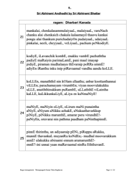 21 22 23 24 25 உ Sri Abhirami Andhadhi by Sri Abhirami Bhattar ragam: Dharbari Kanada mankalai, chenkalasammulaiyaaL, malaiyaaL, varuNach chanku alai chenkaich chakala kalaamayil thaavu kankai pongu alai thankum purichadaiyOn pudaiyaaL, udaiyaaL pinkalai, neeli, cheyyaaL, veLiyaaL, pachum peNkodiyE. kodiyE, iLavanchik kombE, enakku vambE pazhuththa padiyE maRaiyin parimaLamE, pani maal imayap pidiyE, piraman mudhalaaya thEvaraip peRRa ammE! adiyEn iRanthu inku inip piRavaamal vandhu aandu koLLE. koLLEn, manaththil nin kOlam allaathu; anbar koottanthannai viLLEn; parachamayam virumbEn; viyan moovulakukku uLLE, anaiththinukkum puRambE, uLLaththE viLaintha kaLLE, kaLikkunkaLiyE, aLiya en kaNmaNiyE! maNiyE, maNiyin oLiyE, oLirum maNi punaintha aNiyE, aNiyum aNikku azhakE, aNukaathavarkkup piNiyE, piNikku marunthE, amarar peru virundhE!- paNiyEn, oruvarai nin pathma paadham paNinthapinnE. pinnE thirinthu, un adiyaaraip pENi, piRappu aRukka, munnE thavankaL muyanRu koNdEn;- mudhal moovarukkum annE! ulakukku abiraami ennum arumarunthE!- ennE?-ini unnai yaan maRavaamal ninRu EththuvanE. Raga Arrangement: Thiruppugazh Guruji Thiru Raghavan Page: 6 / 22